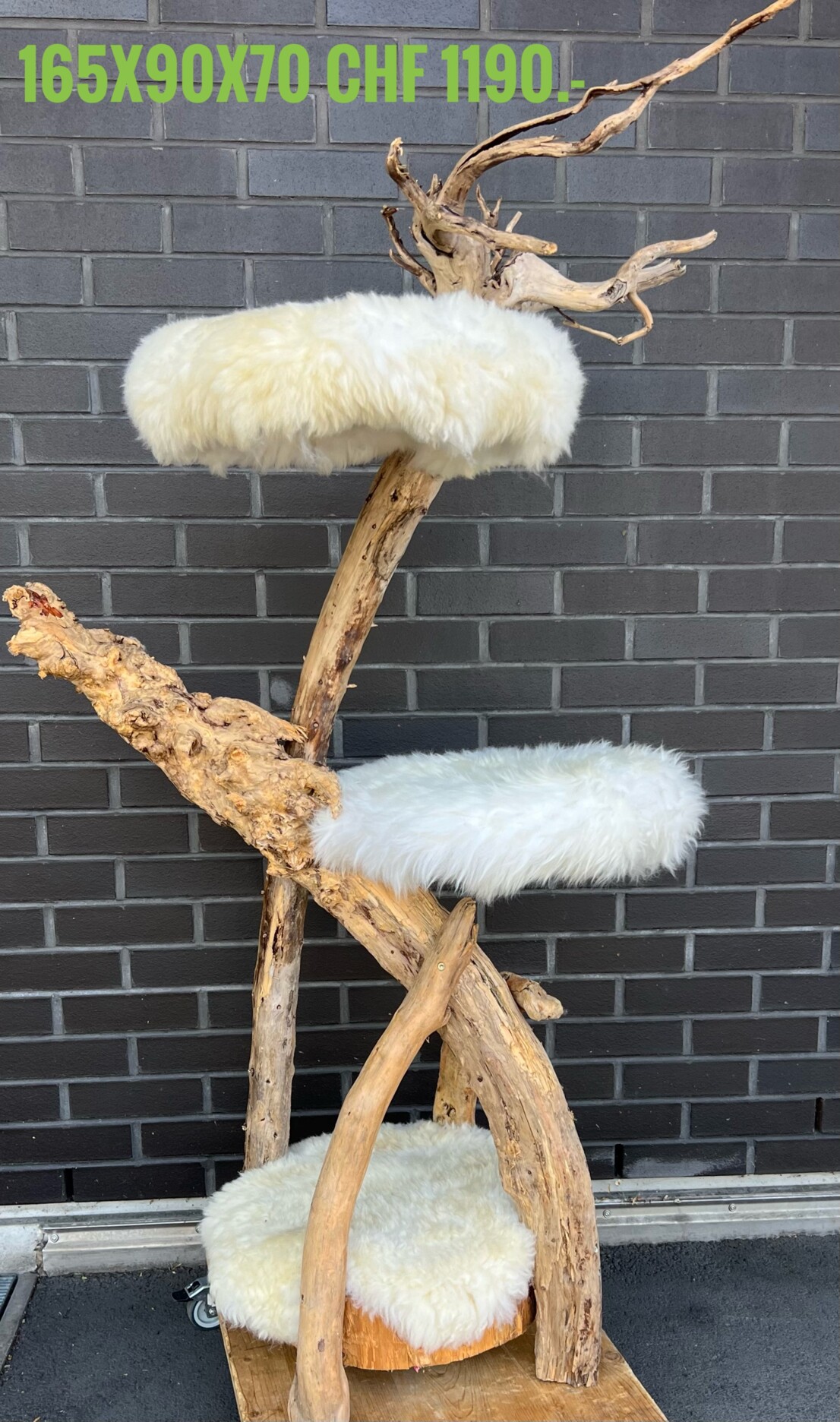Für alle diese Lebensbereiche, ein ganzes Katzenleben lang, können Sie Ihrer Katze einen Naturkatzenbaum D-Design schenken. Wir fertigen diesen von Hand aus Toxin freiem Naturholz und echtem Schaffell aus der Region Thun und Bern. Je nach Modell kombinieren wir ihn mit schönen Natursteinen.